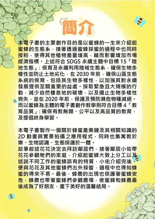 本電子書的主要創作目的是以蜜蜂的一生來介紹起蜜蜂的生態系,接著透過蜜蜂採蜜的過程中也同時授粉,使得其他植物產量增高,藉而影響增加市場經濟指標。上述符合SDGS永續主題中目標15「陸地生態」: 保育及永續利用陸域生態系,確保生物多樣性並防止土地劣化,在2030年前,確保山區生態系統的保育,包括其生物多樣性,以加強其對永續發展提供至關重要的益處。採取緊急且大規模的行動,減少自然棲息地的破壞,以及遏止生物多樣性喪失,並在2020年前,保護及預防瀕危物種滅絕。而以蜜蜂為主體的電子書創作教學則符合目標4「教育品質」:確保有教無類、公平以及高品質的教育,及提倡終身學習。