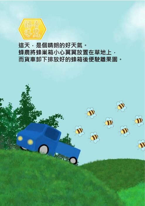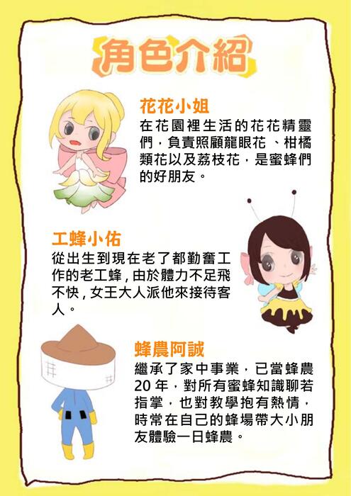 本電子書製作一個關於蜂蜜產業鏈及其相關知識的2D動畫與實景拍攝之應用程式,同時也集寓教於樂、生物認識、生態保護於一體。 故事敘述花花決定去拜訪鄰居們,接著鄰居小佑帶花花參觀牠們的家庭,介紹起蜜蜂大致上分工以及述說不同工作的蜜蜂該有的特質,小佑介紹完後,便與花花及其他蜜蜂們出外採蜜,過程中也得知蜂蜜的得來不易。最後,蜂農的出現也保護著蜜蜂安危,蜂農也帶著蜜蜂們參觀農場,使蜜蜂和蜂農最後成為了好朋友,畫下美好的溫馨結局。