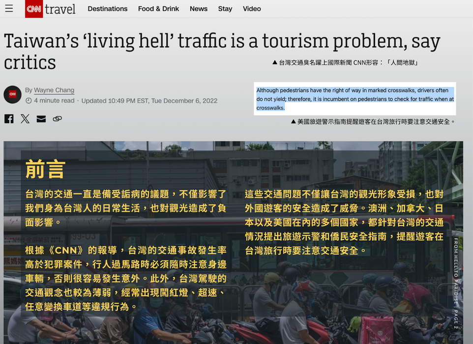 台灣的交通一直是備受詬病的議題,不僅影響了我們身為台灣人的日常生活,也對觀光造成了負面影響。根據《CNN》的報導,台灣的交通事故發生率高於犯罪案件,行人過馬路時必須隨時注意身邊車輛,否則很容易發生意外。此外,台灣駕駛的交通觀念也較為薄弱,經常出現闖紅燈、超速、任意變換車道等違規行為。這些交通問題不僅讓台灣的觀光形象受損,也對外國遊客的安全造成了威脅。澳洲、加拿大、日本以及美國在內的多個國家,都針對台灣的交通情況提出旅遊示警和僑民安全指南,提醒遊客在台灣旅行時要注意交通安全。