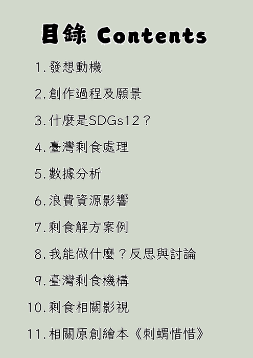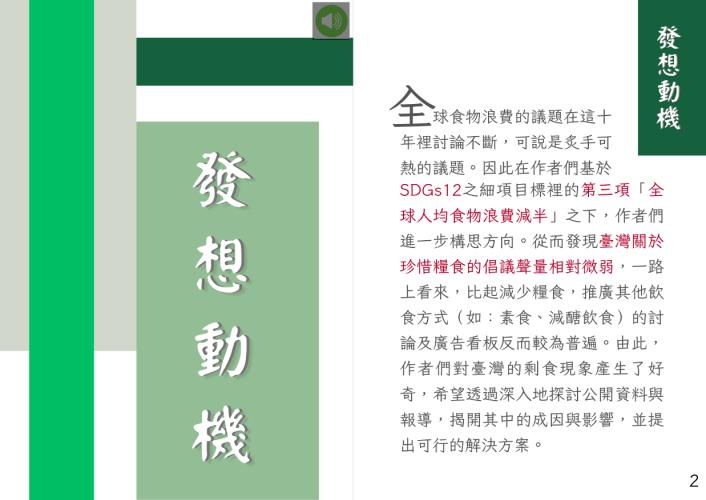 於SDGs12細項目標12.3之全球人均食物浪費減半為出發點下,作者們進一步構思題目時,發現其實在臺灣,呼籲不要浪費糧食的聲量不大,因此作者們對臺灣的剩食率感到好奇,進而想深入探討,並從而揭開其中的成因與影響,再提出預想的解決方案。