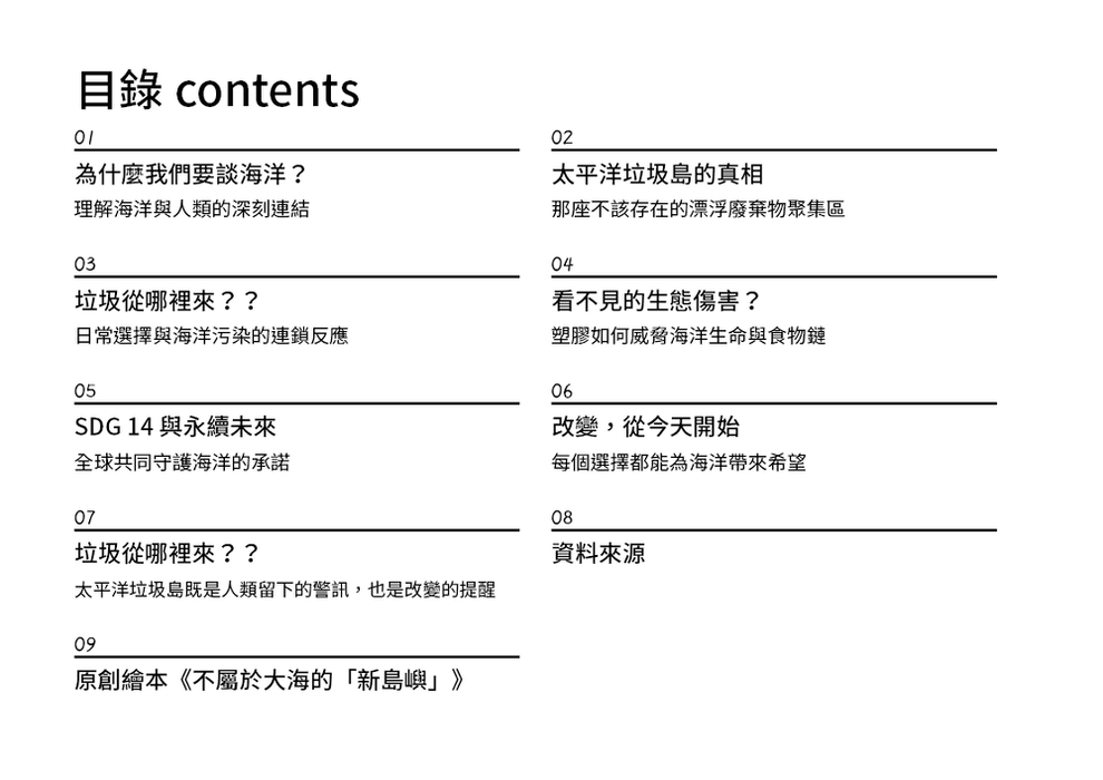 太平洋垃圾島的存在,是人類長期忽視海洋後留下的集體痕跡,也是一個無法再被忽略的警訊。它提醒我們,便利生活所產生的廢棄物並未消失,而是轉移到看不見的海域,持續影響海洋生態與人類未來。聯合國永續發展目標第 14 項所關注的,不只是保護海洋生物,更是建立人類與海洋之間更負責任的關係。當我們開始減少不必要的浪費,重新思考消費與選擇,海洋仍然有機會恢復原有的藍色。保護海洋,不只是為了自然本身,而是為了確保人類能擁有一個可以延續的未來。