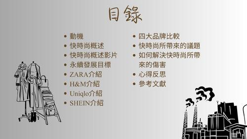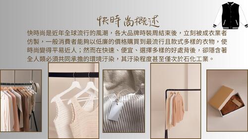 在本電子書中,我們藉由現代快時尚的趨勢,來探討因快時尚所導致的環境汙染、勞工議題等,並延伸至自我的消費反思,來實現減少資源浪費與環境破壞的問題。