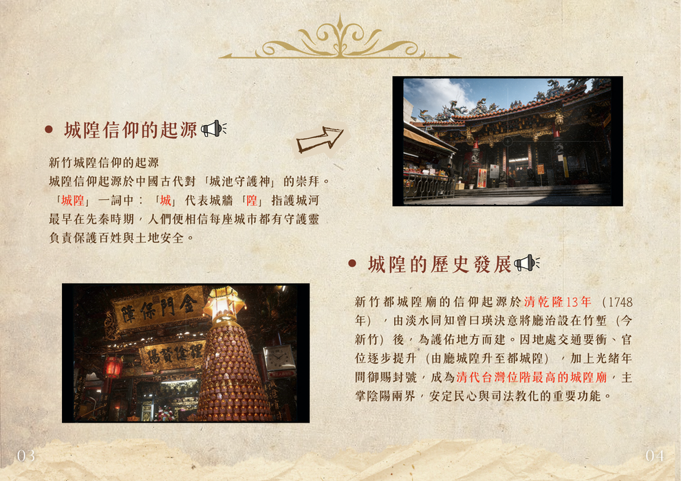 在「城隍廟與新竹在地生活」中,探討城隍廟與居民日常生活及廟口文化的連結;「文化的當代保存」則分析在現代社會中,城隍廟在保存與推廣上所面臨的挑戰與轉變。