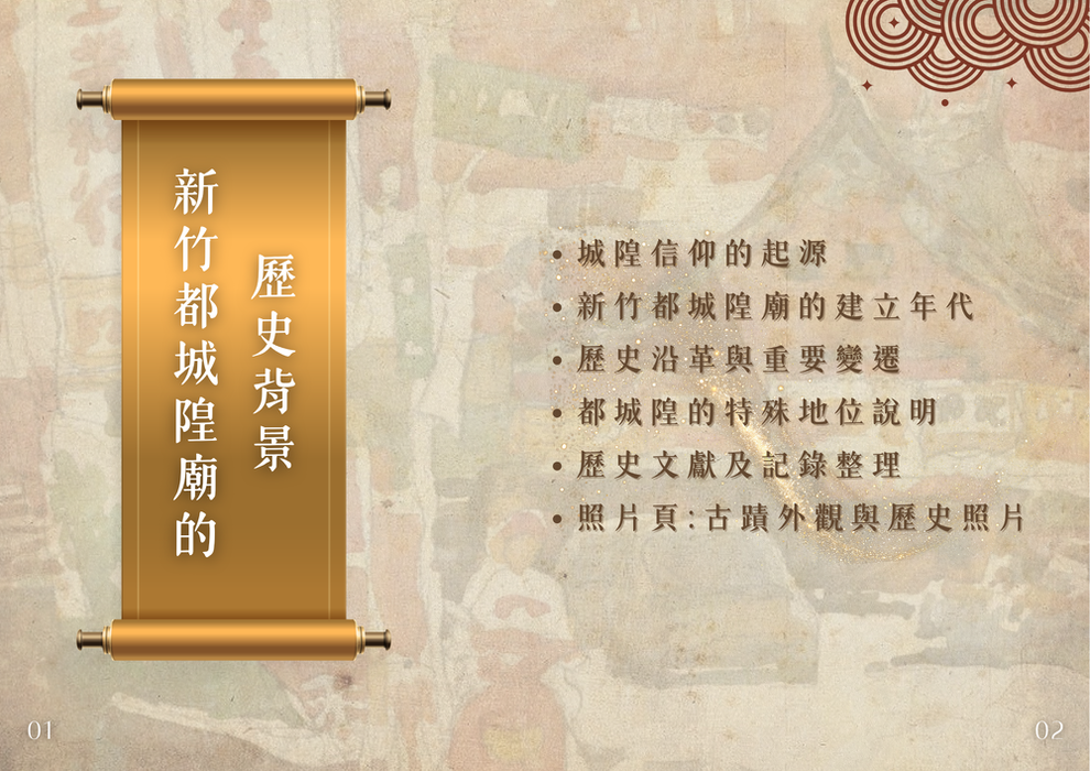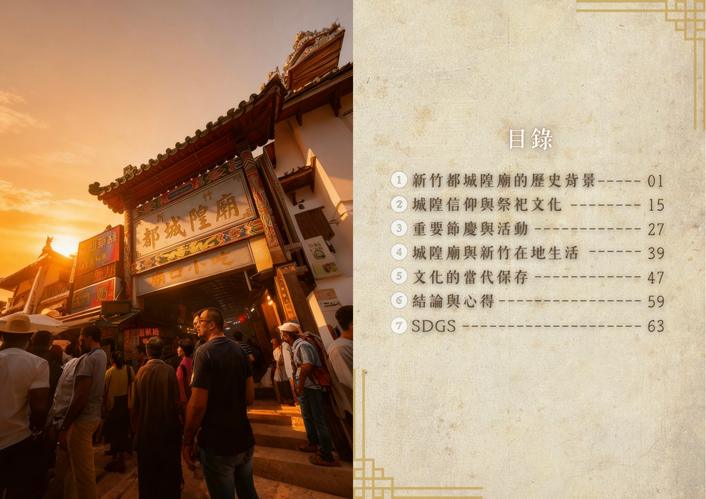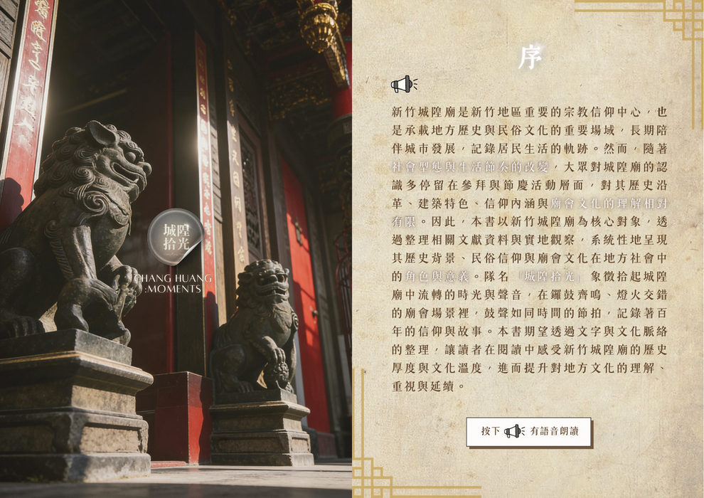 本電子書以新竹地區的重要文化資產──新竹都城隍廟為主題,內容架構清晰,從多個面向介紹其文化內涵。首先,在「新竹都城隍廟的歷史背景」中,說明其創建歷程與歷史地位,呈現其在地方發展中的重要角色。