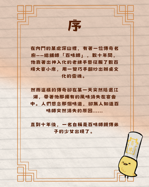 於是阿農離開隱居的深山,踏上了她的總舖師修煉之路......