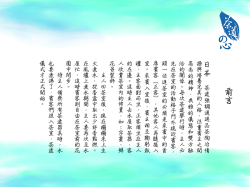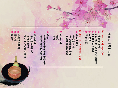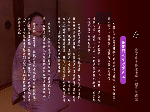 我們有請到在中國茶與日本茶經營了三十餘年,擁有教授級證照的老師做顧問,更追隨老師多日並親自參與茶會進行專訪、拍攝茶席展演,終獲得無數珍貴影片資料,製作了「茶道的心」,來介紹日本茶道的基本知識,體驗品茶陶冶性情,讓想懂茶或不懂茶的你,能初步去瞭解日本茶道的精髓。