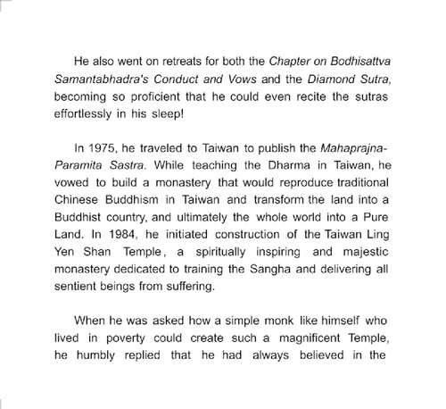 This collection of aphorisms is selected from the daily Dharma lectures given by our Teacher, the late Venerable Master Miao Lien. On June 25, 2008, he entered Nirvana at the Ling Yen Shan Temple in Nantou, Taiwan. He had been a fully ordained monk for sixty-seven years. We pray that our Venerable Master will soon return to the Saha World in accordance with his vows to save infinite sentient beings and perfect the Bodhi. It is our sincere hope that readers may absorb compassion and wisdom from the "sweet dew" of Dharma and, by applying those virtues in their daily lives, purify their bodies and minds and become infused with Dharma bless.