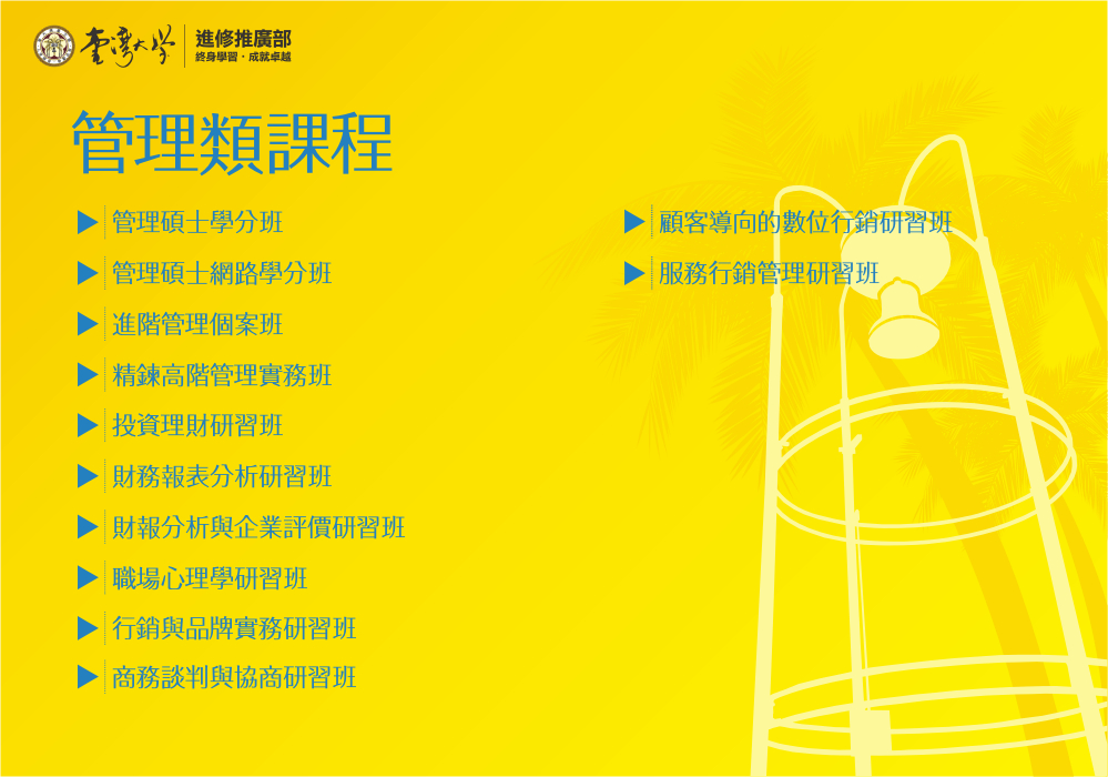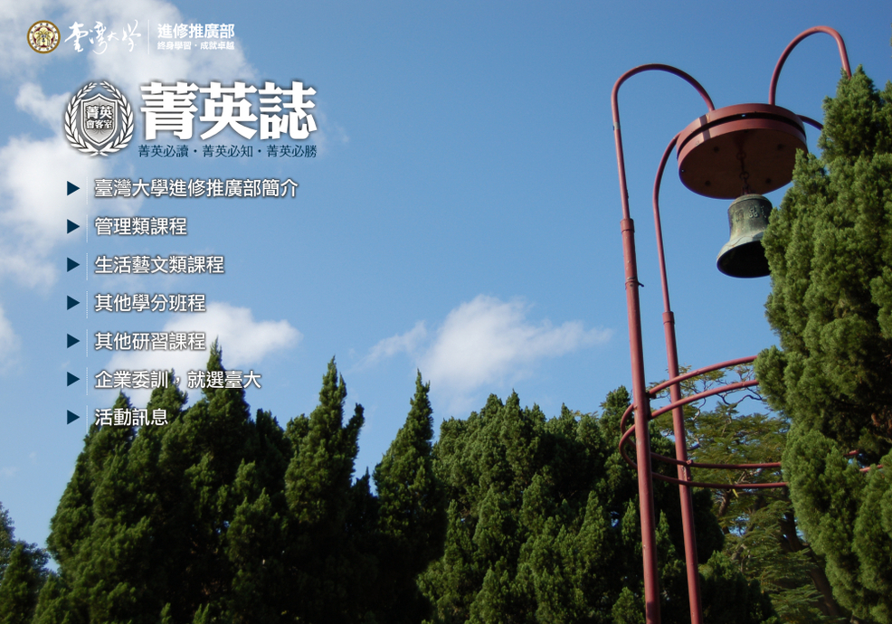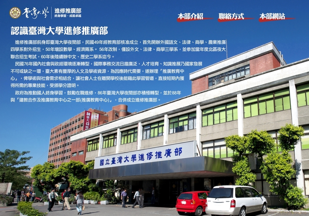 (2)活用台大資源 (3)發揮知識影響 (4)建立效能組織 我相信臺大推廣部在過去歷任主任與同仁的努力下,進步是有目共睹的,但始我們仍需自我驅策,希望本部所有的學員與同仁都能在未來感受到這是一個快樂而愉悅的學習環境與工作環境。 |