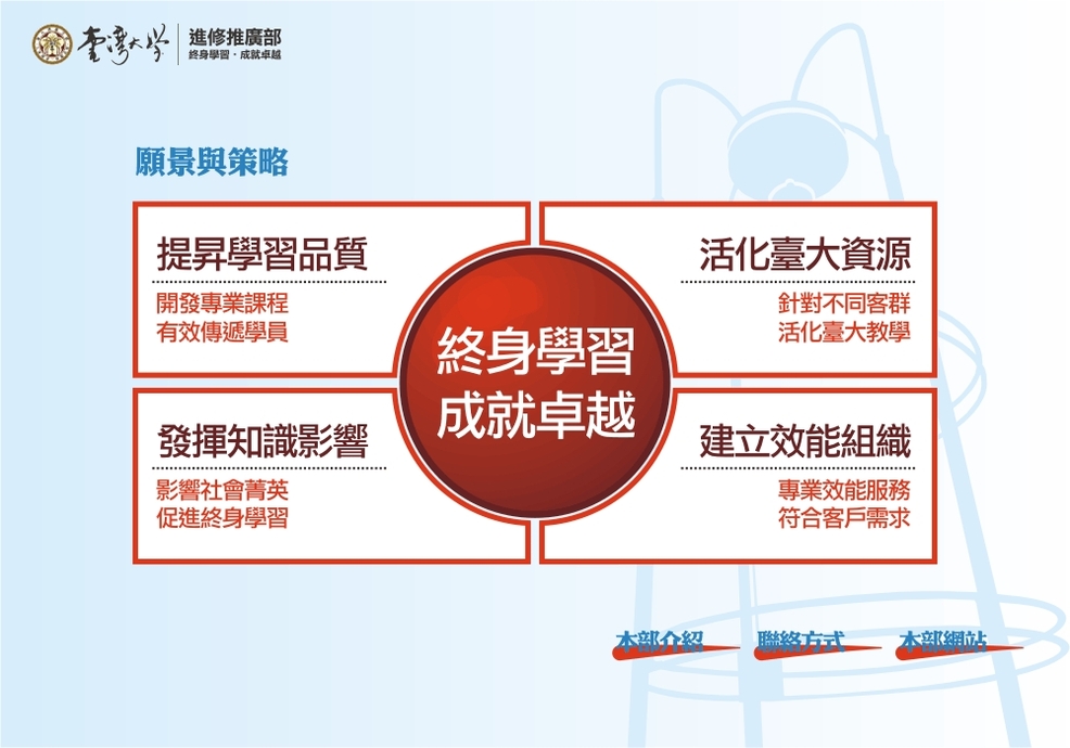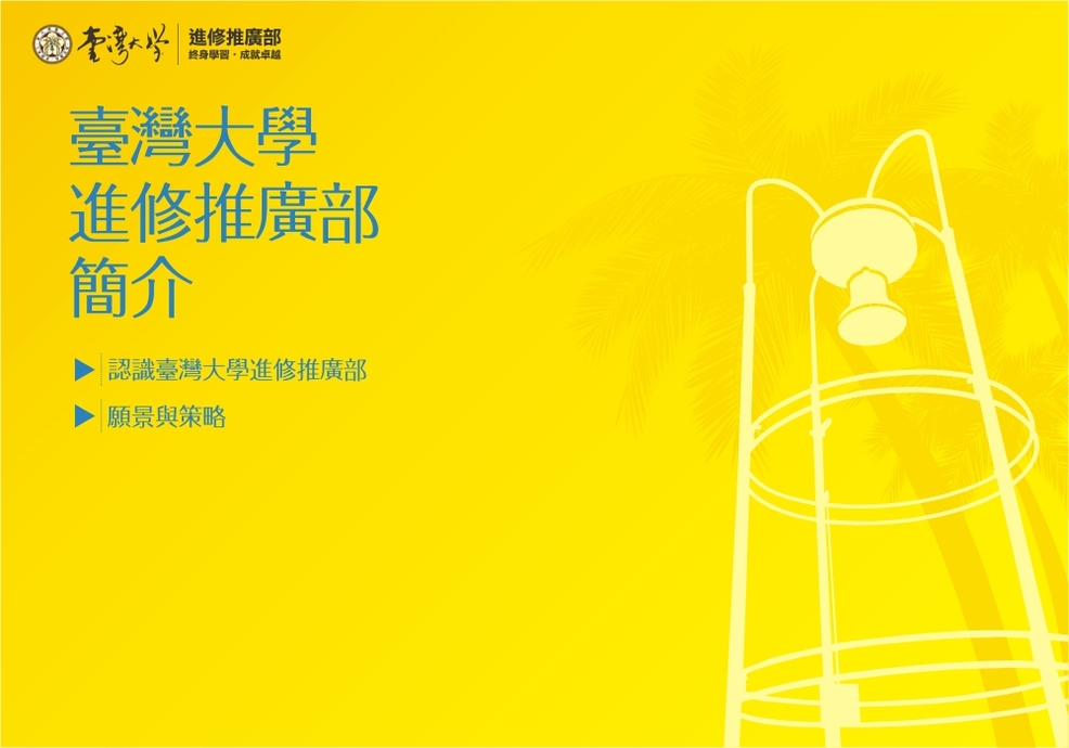 臺灣大學是全國最好的綜合大學,社會上許多人不得其門而入,而臺大推廣教育的設立即基於臺大的社會責任,提供給社會人士前來進修充電的場所。 曾有人問及,「臺大推廣教育到底是營利機構,還是非營利機構?又有何特色在諸多大學中脫穎而出?」我個人認為它既是營利機構,但也兼具了非營利機構的特色,不全以利益為導向,而是善盡臺大的社會責任,更具體的說,就是要「透過臺大推廣,增加對社會的影響力,以知識的平台,產生正面向上的力量」。為了發揮這個功能,它本身必須有財務能力維持運作,為了發揮效能,它必須有現代化「經營管理」的理念,有效利用臺大的資源。 簡言之,本部的願景是「終身學習,成就卓越」,達成願景的四大策略方向可敘述如下: |