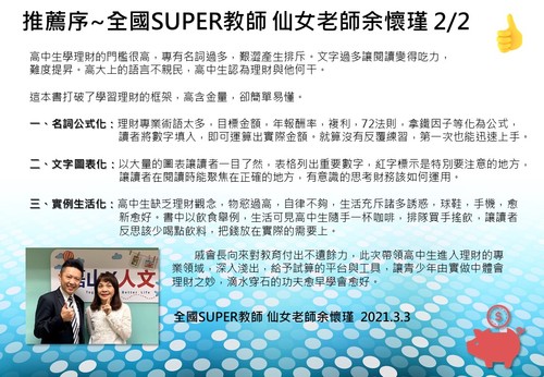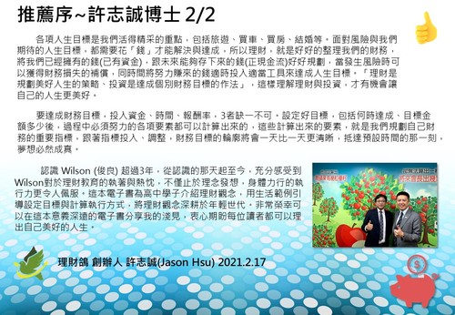 現在的年輕世代生長在一個資訊容易取得且網路使用便利的時代,在這世代充滿著許多需要判斷的價值觀與財務規劃選擇,若無一個正確的教育環境與正確觀念的資訊引導,可能會讓許多年輕學子會因為一時衝動而做出不正確的財務選擇判斷,進而甚至可能導致人生成長過程中一連串錯誤的決定而陷入財務困頓。有鑑於此,希望透過這本電子書閱讀容易與網路傳遞方便,讓更多年輕學子認識與瞭解做任何財務規劃判斷前,充分瞭解自己的承擔能力以及明確財務規劃的內容。學會開始讓自己在成長過程中做出每一個正確的財務規劃判斷。